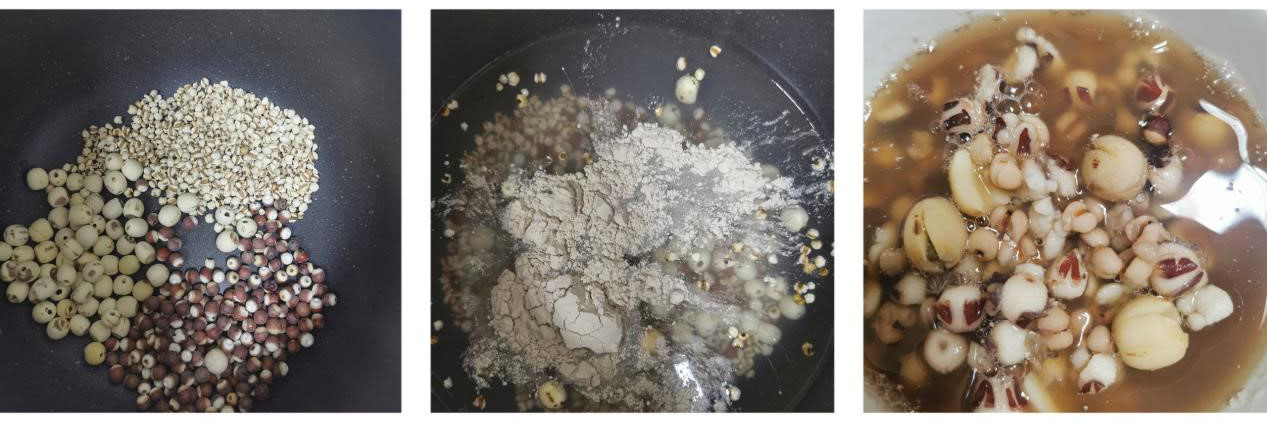 3、将芡实、莲子、炒薏苡仁放入砂锅中一起熬制,加茯苓粉;